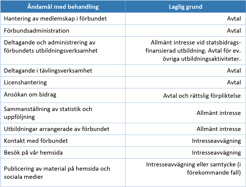 Ändamål med behandling Förbundet har nedan sammanställt den lagliga grunden för behandlingen av personuppgifter som sker inom förbundets verksamhet.
